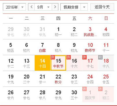 根據(jù)《國(guó)務(wù)院辦公廳關(guān)于2016年部分節(jié)假日安排的通知》和省政府辦公廳有關(guān)通知精神,2016年中秋節(jié)放假日期新鄉(xiāng)市天豐振動(dòng)機(jī)械有限公司具體安排如下:9月15日至17日放假調(diào)休,共3天。9月18日(星期日)上班。