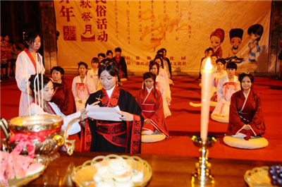 在月下,將月亮神像放在月亮的那個(gè)方向,紅燭高燃,全家人依次拜祭月亮,然后由當(dāng)家主婦切開(kāi)團(tuán)圓月餅。切的人預(yù)先算好全家共有多少人,在家的,在外地的,都要算在一起,不能切多也不能切少,大小要一樣。